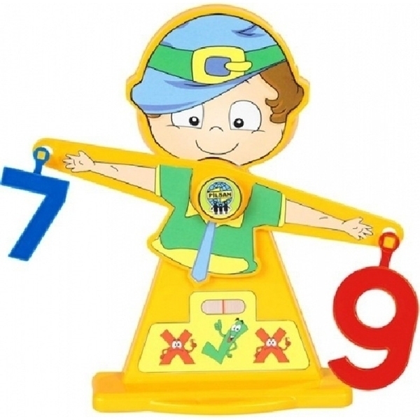 Эти весы выполнены в виде интересного мальчика. Они точно не оставят равнодушным ни одного малыша. Суть игры с числовыми весами заключается в том, что нужно повесить на его руки цифры и показать ребенку, какая из них больше. Числовые весы Pilsan Number Balance помогают карапузу с раннего детства освоить навыки счета и математики. Чтобы руки мальчика находились на одном уровне, на его руки нужно повесить числа, равные друг другу. Так, например, если слева расположить цифру «5», то с другой нужно повесить сумму чисел «3 + 2». Таким образом, карапуз сможет в игровой форме обучится устному счету.