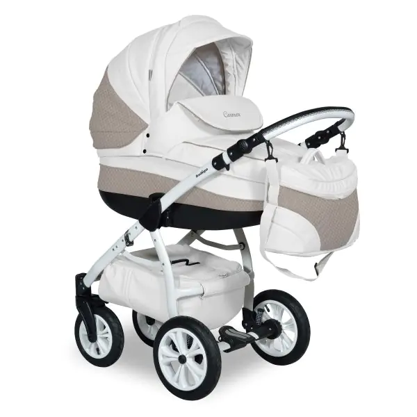 Особенности тип: универсальная коляска зима–лето¶возрастная категория: 0-36 месяцев¶компактные габариты в сложенном виде¶красивый классический дизайн и цветовые решения в светлых натуральных тонах¶основной материал: морозоустойчивая эко-кожа, не подверженная воздействию влаги и солнца¶аксессуары: сумка для мамы (крепится на ручку при помощи карабинов или широкого ремня), дождевик, москитная сетка, утепленные чехлы, матрасик в люльку, корзина для покупок.