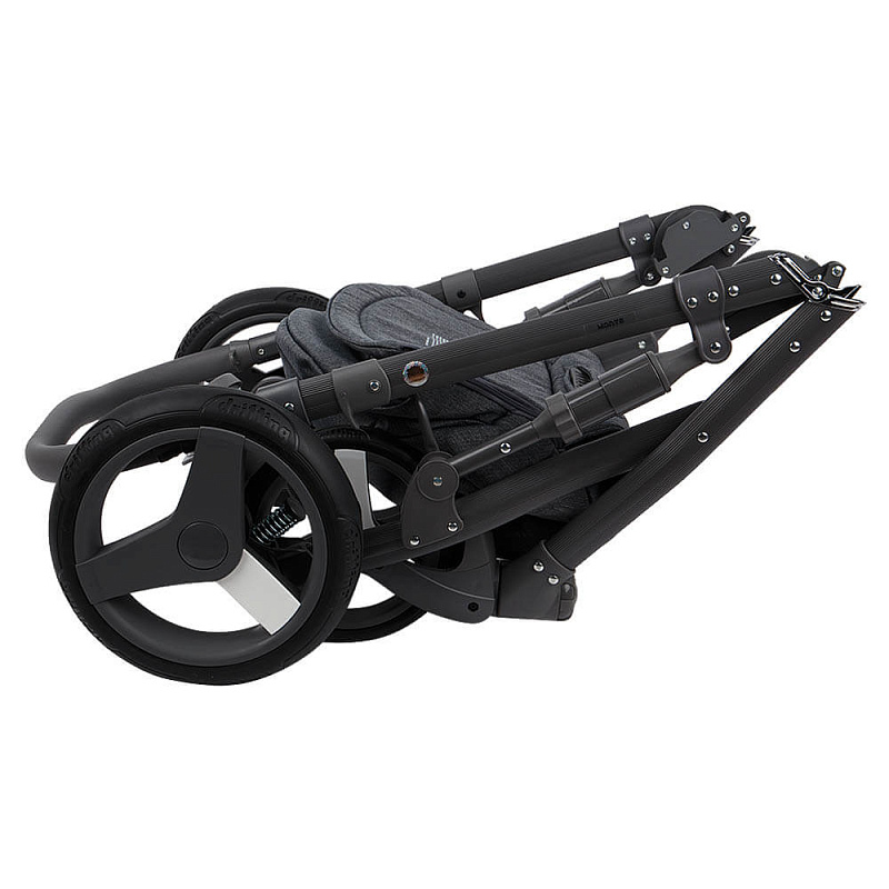 Шасси в коляске «Монте» легкое и компактное. Установлена двойная амортизация — на задних колесах (можно регулировать) и на центральной раме (можно блокировать). Колеса изготовлены из вспененной резины, которая не боится проколов и не требует подкачивания. Передние колеса меньше в диаметре, могут вращаться на 360 градусов. Задние колеса отвечают за торможение. Внизу на шасси установлена багажная корзина закрытого типа. Ручка для родителей регулируется по высоте (9 позиций).