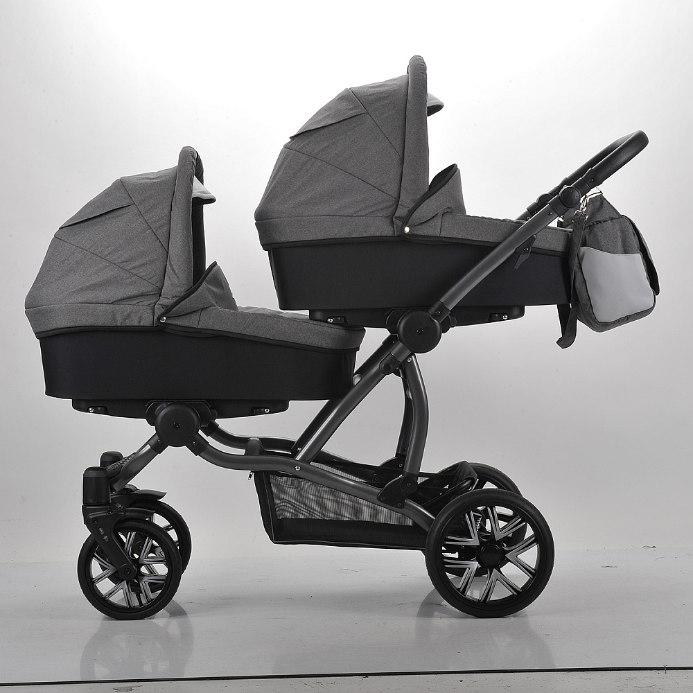 Рама в коляске алюминиевая. На колесах стоят пружинные амортизаторы с регулировкой жесткости. Колеса надувные, на подшипниках, с отличной проходимостью. Ручка регулируется по высоте. На раму можно установить две люльки либо два прогулочных блока в разных направлениях. Также можно установить автолюльки. Блоки можно «миксовать».