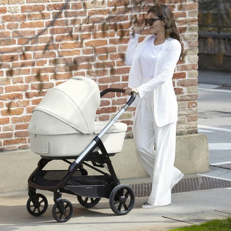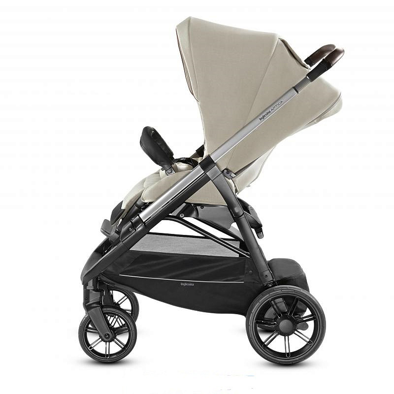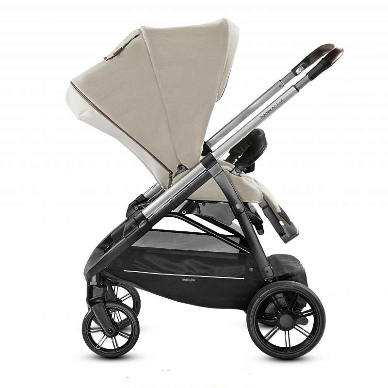 Шасси складывается «книжкой», устойчива в сложенном виде. Имеет компактные размеры, ручка регулируется по высоте в четырех положениях. Колеса большие, с шариковыми подшипниками, выполнены из полиуретана. Передние колеса меньше в диаметре и имеют функцию свободного вращения. Тормоз единый автоматический, надежно стопорит задние колеса во время торможения. Корзина для вещей просторная, оснащена карманом на молнии и усиленным дном. Контур корзины, как у всех последних моделей Inglesina, украшен светоотражающими элементами.