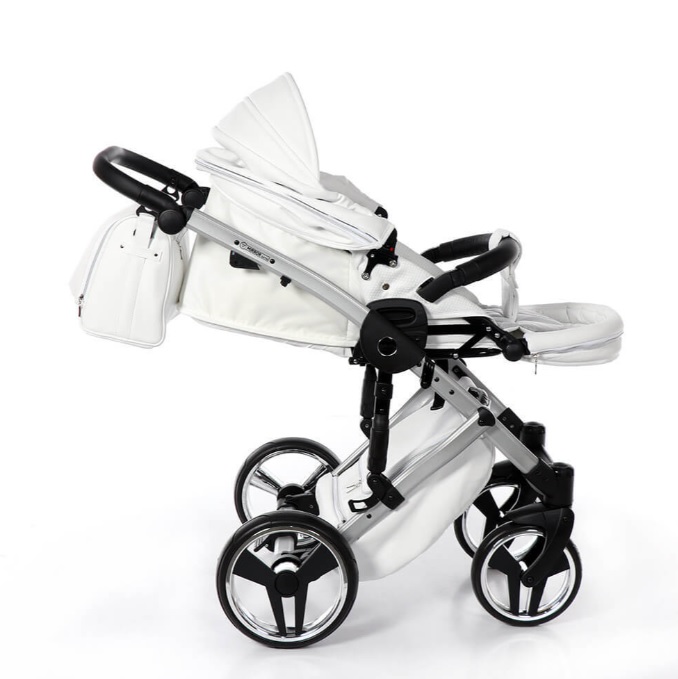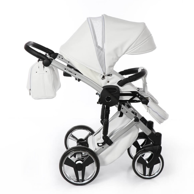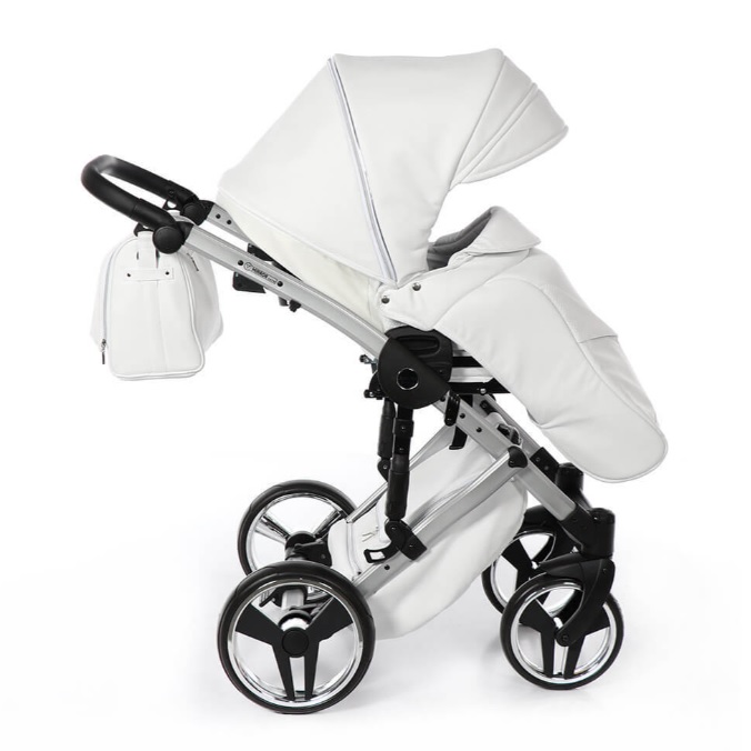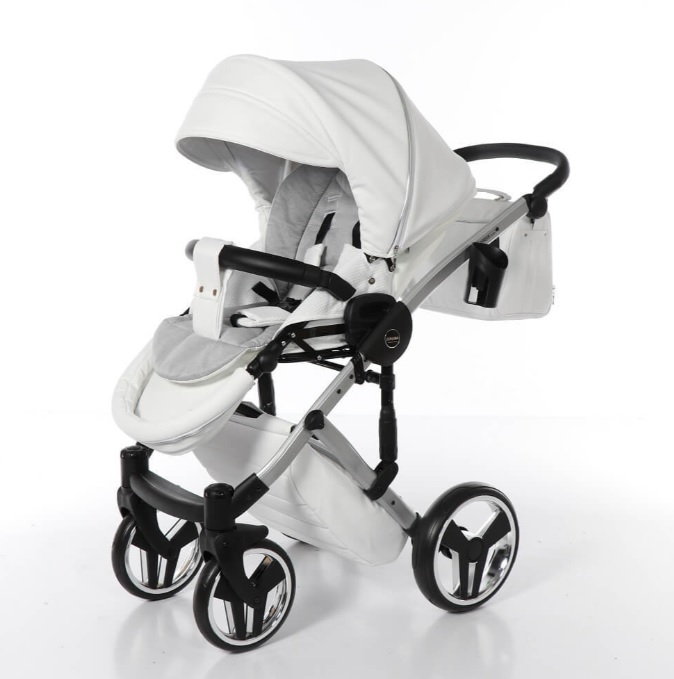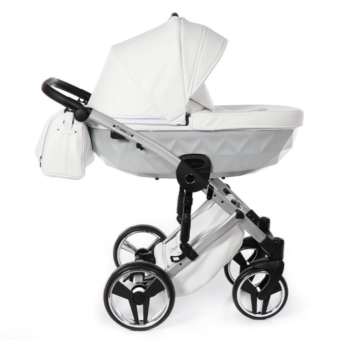 Коляска Junama Diamond Mirror Satin V2 дополнена стильной сумкой на ручку, дождевиком, москитной сеткой и подстаканником.