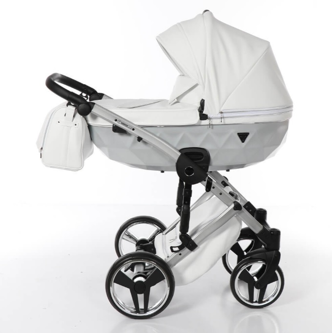 Коляска Junama Diamond Mirror Satin V2 2 в 1 увидела свет в 2022 году. Это продолжение знаменитой линейки Diamond с коррекцией в дизайне и легким механизмом съема люльки одной кнопкой. По дизайну люлька впечатлит не только родителей, но и прохожих. В качестве материала для внешнего покрытия используется дорогая премиальная ткань.