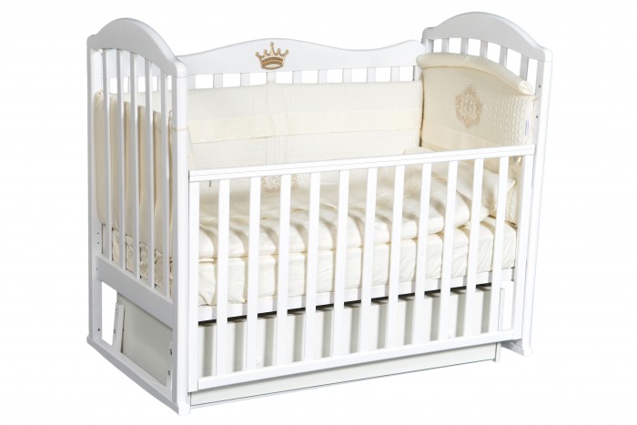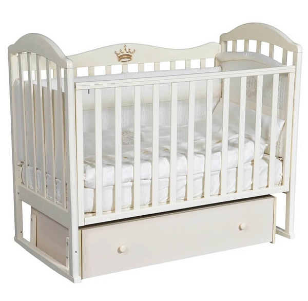 Кроватка оснащена универсальным маятником, вы можете выбрать положение, в котором удобнее раскачивать кроватку, и поменять маятник в процессе использования. Передняя стенка имеет скрытый механизм регуляции, что делает кроватку более безопасной: ведь поменять уровень положения стенки может только взрослый человек! Дизайн кроватки Антел Анита 9 примечателен тем, что не только верхушки боковых стенок кроватки имеют округлую форму, но и задняя стенка. Кроватка изготовлена из массива березы, округлые части сделаны из высококачественного МДФ. 3д наклейка в виде короны украсит классический дизайн кровати, вы сможете сами выбрать место, куда приклеить накладку.