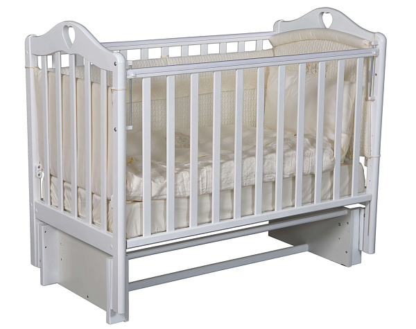 Маятник можно установить в двух позициях — вдоль и поперек. При монтаже кроватки родители могут поставить устройство в нужном направлении. Если качание не требуется, механизм можно застопорить или вовсе убрать: тогда кроватка встанет на обычные ножки.