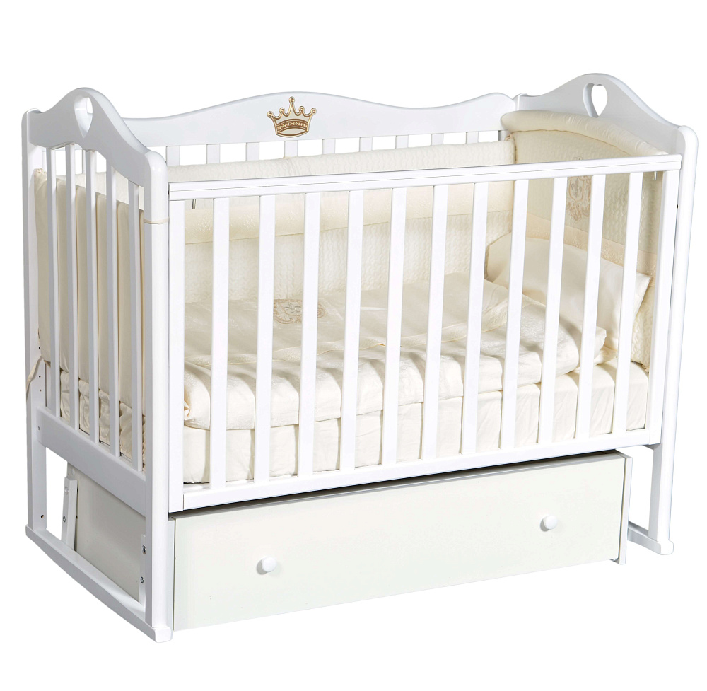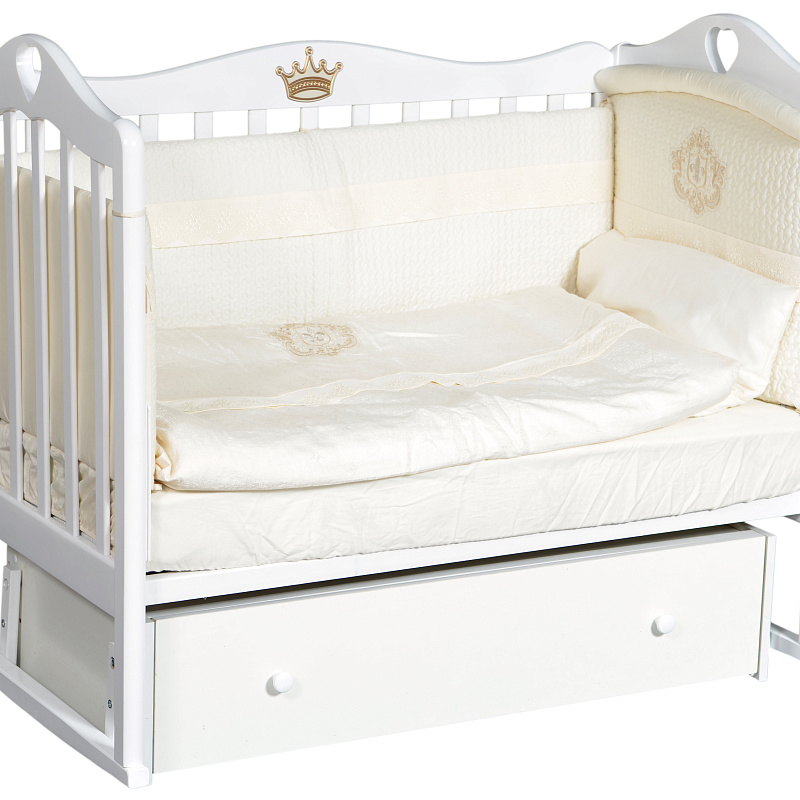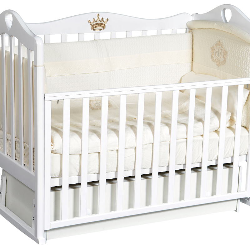 Производитель «Антел» представляет новинку 2020 года — классическую кроватку «Каролина» 5 с аппликацией в виде короны, фигурными боковыми спинками с вырезанными сердечками, маятником с функцией продольного или поперечного укачивания и закрытым ящиком для хранения детских вещей.