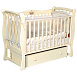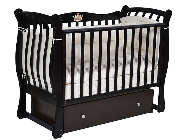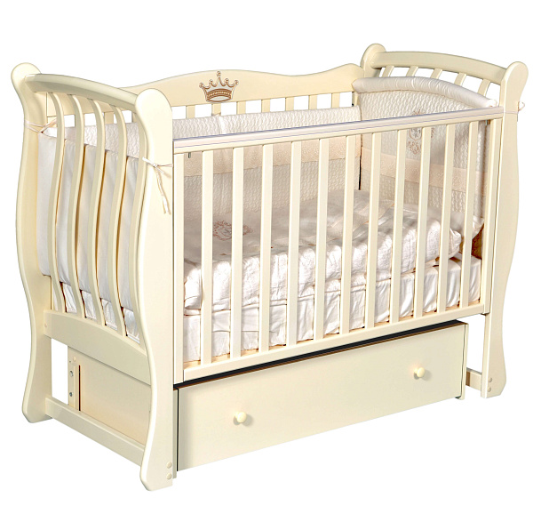 Спальное место сделано из деревянных реек, которые образуют ортопедическое ложе. Оно хорошо вентилирует воздух, что очень хорошо с точки зрения здоровья. Ложе имеет два положения, чтобы мама могла регулировать высоту в зависимости от роста и возраста ребенка. Под спальной основой располагается вместительный закрытый ящик для вещей. Аппликация "Корона" в комплект кроватки не входит и приобретается отдельно.