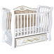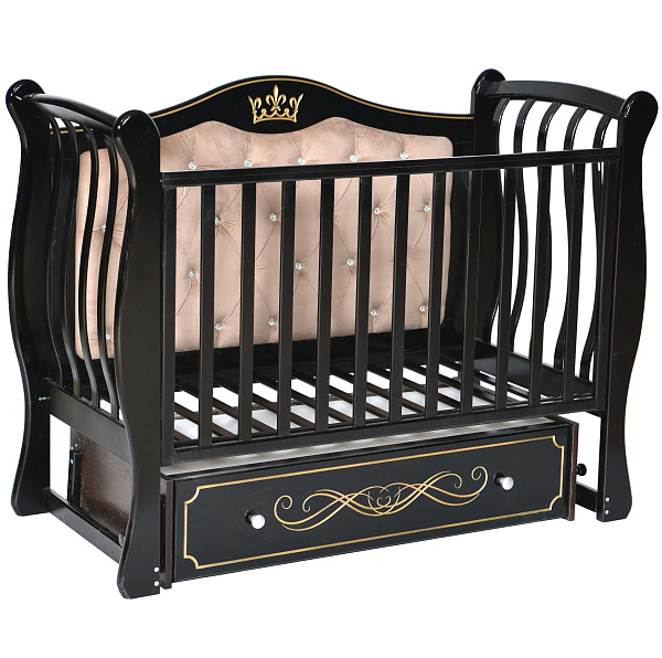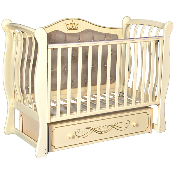 Модель Luiza 333 с мягкой спинкой — дизайнерская кровать из березы для детей от 0 до 3-4 лет. Задняя стенка обшита велюровой тканью, кроватка украшена оригинальным декором и стразами. Оснащена универсальным маятниковым устройством с возможностью укачивать малыша вдоль или поперек, а также фиксировать устройство, если функция укачивания не нужна.