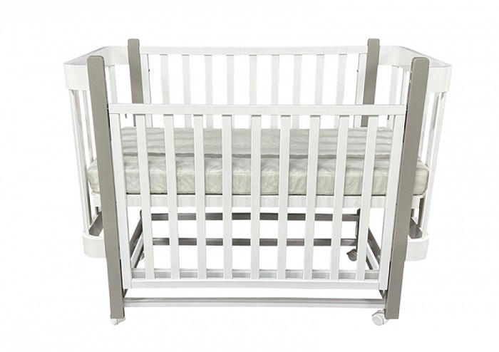 Передняя стенка снабжена курком, который позволяет стремительно менять высоту переднего ограждения или целиком его убрать для использования кровати как диванчика. Матрасик в комплект кроватки не входит: вы можете приобрести его в нашем интернет-магазине отдельно.