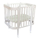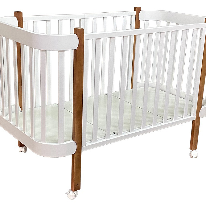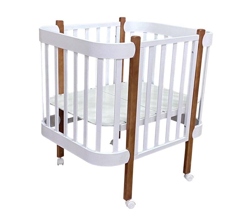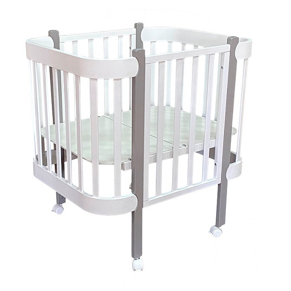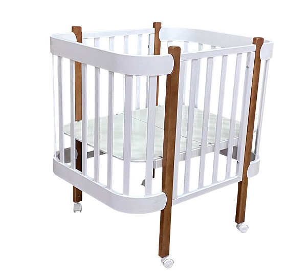 Трансформация из маленькой кроватки в большую сопровождается тем, что передняя стенка снимается, а вместо нее устанавливается небольшой бортик в виде мишки. Он дает возможность ребенку самостоятельно залезать и вылезать из кроватки, обеспечивая безопасность во время сна. В кроватке есть колеса для перемещения по комнате и продольный маятник для укачивания новорожденного.
