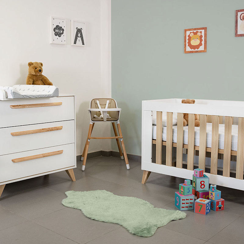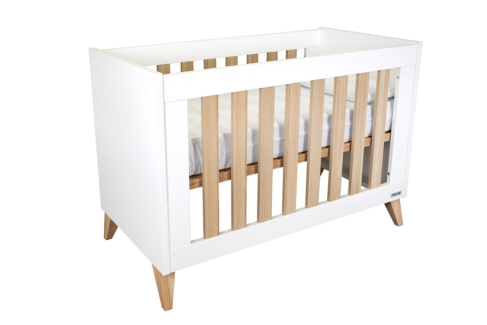 IKid Lazio – кроватка, сделанная в современном лофтовом дизайне. Каркас кровати белый, дополняется ламелями натуральных расцветок.