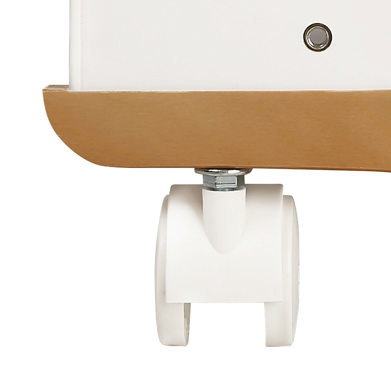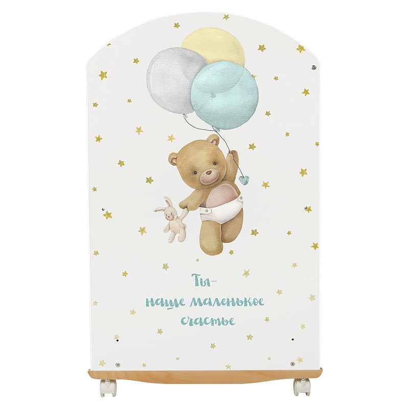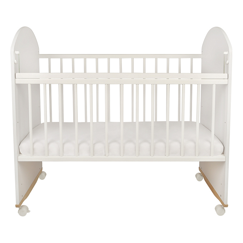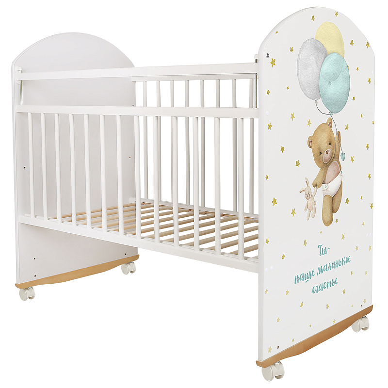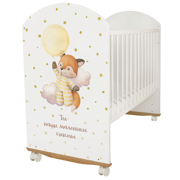 У этой модели фигурная спинка. Колеса идут в комплекте. Прутья размещены на безопасном расстоянии для ребенка. Передняя стенка регулируется по высоте. Боковые части кроватки украшены изображением сказочных животных — медвежонка, лисенка и слоненка.
