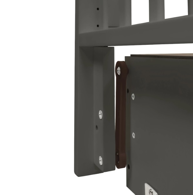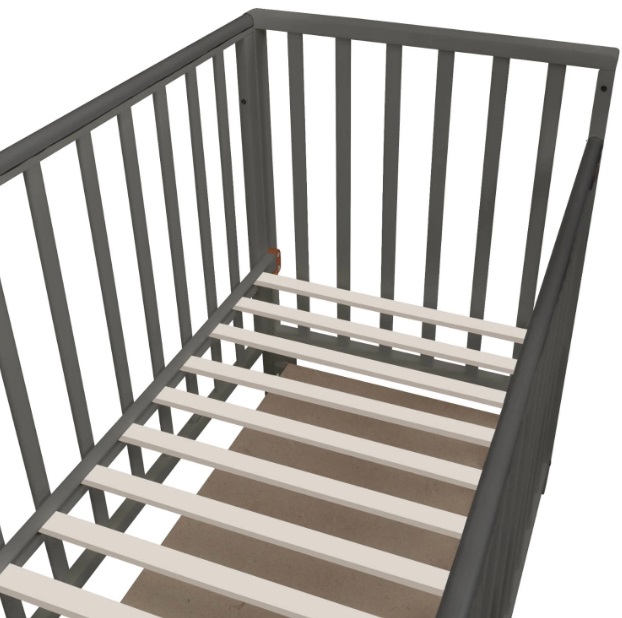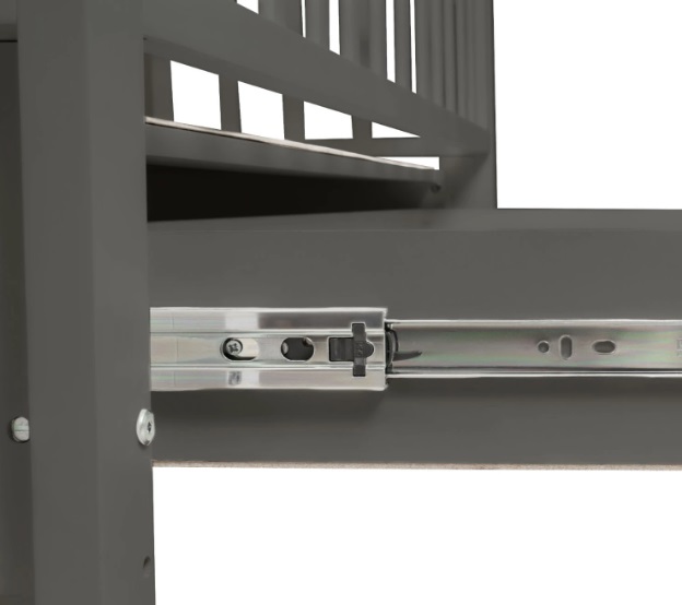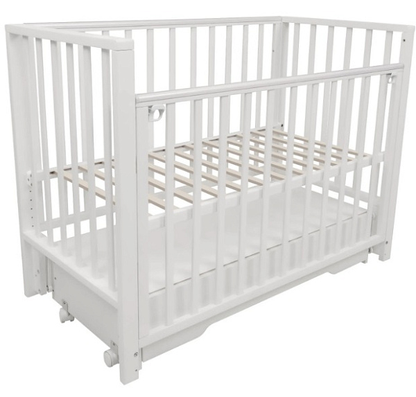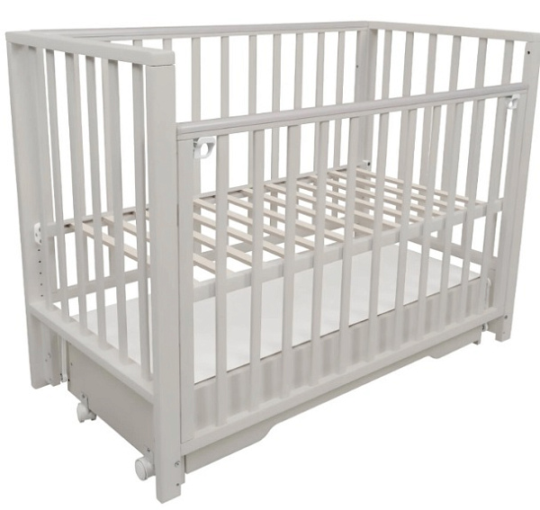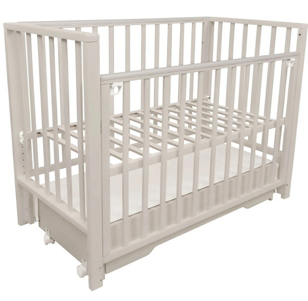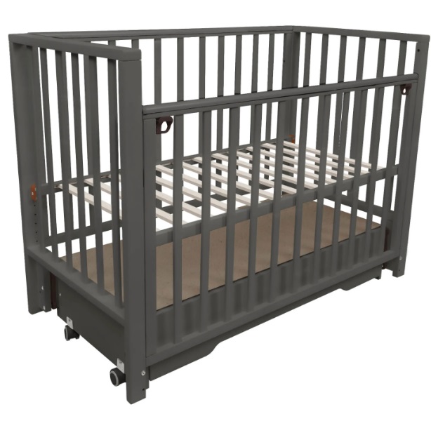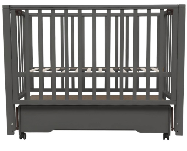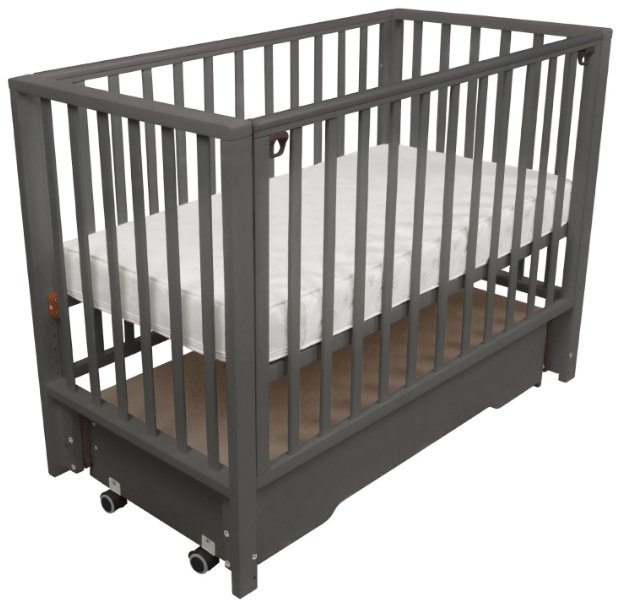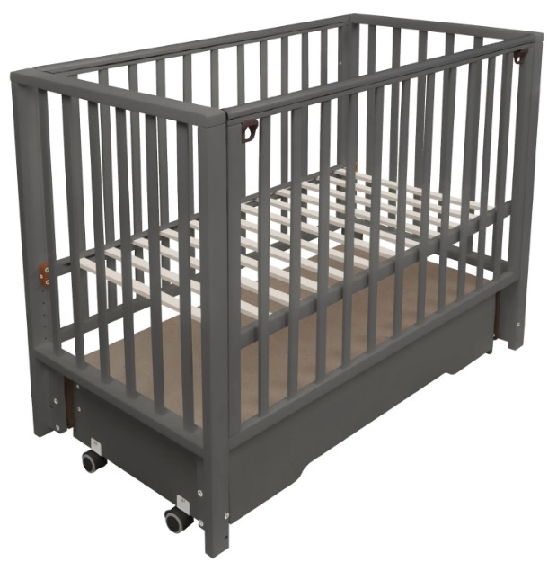 В конструкции кроватки также предусмотрен закрытый ящик с доводчиком. В нем удобно хранить постельное белье и детские аксессуары. Переднюю стенку можно быстро снять и не использовать либо просто опускать, чтобы иметь удобный доступ к ребенку. Ложе имеет 5 уровней высоты: 39, 42, 45, 48 и 51 см от пола.