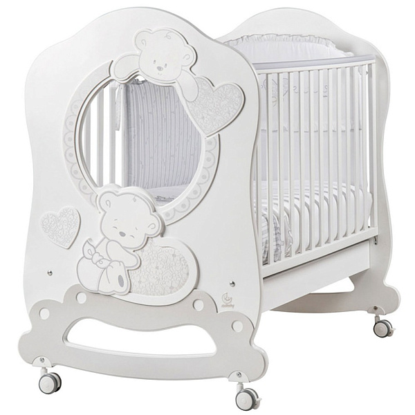 Дно этой кроватки ортопедическое, выполнено из деревянных реек. Спальная основа регулируется в двух положениях: верхнем — для новорожденных и нижнем — для детей постарше. Дополнительно есть возможность купить качалку.
