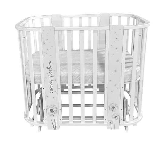 Размер спального места варьируется: 70х100 см для детей от рождения до примерно 2 лет и 70х140 см — для детей до 7 лет. Маленькую версию кровати можно использовать с колесами или с поперечным маятником. Для удобства родителей предусмотрена регулировка высоты ложа.
