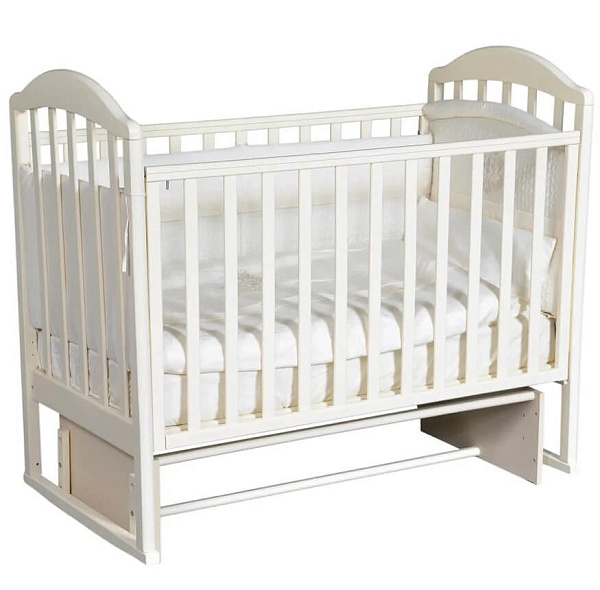 Кроватка сделана из березы, отдельные элементы — из ЛДСП. Ложе из реек, с вентиляцией и ортопедическим эффектом спального основания. Дно кроватки устанавливается в трех позициях: пока малыш кроха, можно устанавливать ложе высоко, чтобы маме было удобно брать ребенка на ручки. Как только ребенок становится на ножки, ложе лучше опускать, чтобы карапуз самостоятельно не мог выбраться из кроватки.