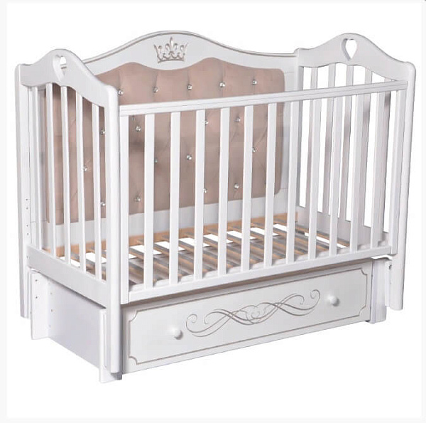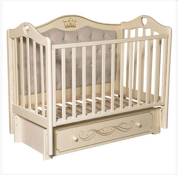 Кроватка «Каролина» 10 — привлекательный предмет мебели для ребенка с рождения до трех-четырех лет. Комбинация мягкой спинки и декоративной резьбы с милыми сердечками идеально подходят для младенцев и хорошо вписываются в любой интерьер.