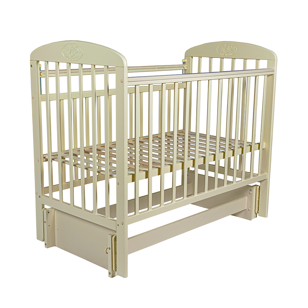 В этой модели линейки кроваток под №9 установлен универсальный маятник, который подразумевает продольное и поперечное укачивание (на выбор родителей). Боковая планка опускается и поднимается с помощью регулирующего устройства. В целом, боковая часть снимается, если необходимо.