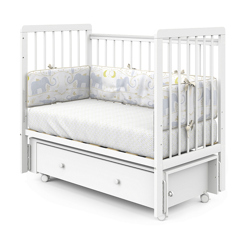 Бортики мебели покрыты накладками (антигрызунками), которые будут особенно полезны во время прорезывания зубов у ребенка, чтобы не травмировать десны. Кроме того, внизу кроватки оборудован вместительный ящик для постельного белья.