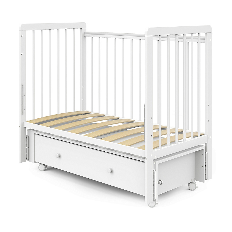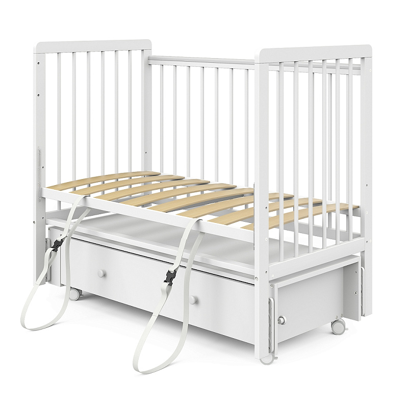 Также кровать максимально функциональна. В кроватку добавлен маятниковый механизм – маятник продольного качания. Его можно использовать, а можно зафиксировать, если укачивание не требуется или если ребенок вырос. У ложа кроватки три положения по высоте: маме удобно будет брать и класть новорожденного ребенка на самом высоком уровне, а более старшему ребенку будет безопасно на опущенном ложе, чтобы не выпасть из кроватки.