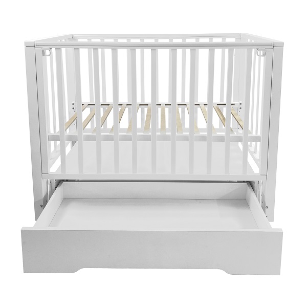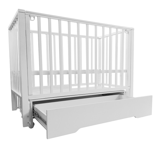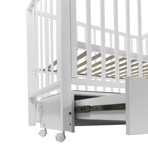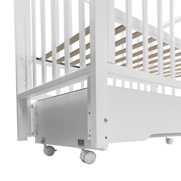 Спальное ложе стандартного размера регулируется по высоте в пяти положениях, позволяя адаптировать кроватку под рост родителей и возраст малыша. Универсальный маятник с возможностью продольного или поперечного качания помогает укачивать ребенка для спокойного сна, а фиксатор обеспечивает устойчивость во время бодрствования. Колеса с тормозами позволяют легко перемещать кроватку по комнате, не повреждая пол. Просторный закрытый ящик с доводчиками обеспечивает бесшумное и плавное открывание, защищая содержимое от пыли и выдерживая значительную нагрузку.