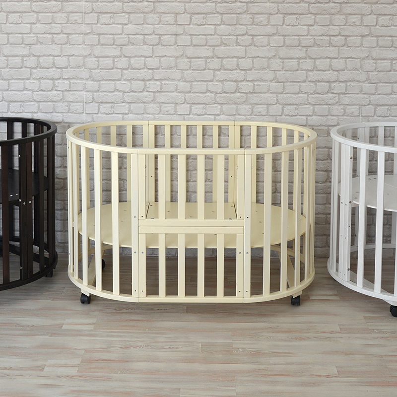 Еще варианты — диванчик для старшего ребенка и приставная кровать для малыша. В этом случае у овальной кроватки нужно снять боковой бортик. Еще один вариант трансформации — манеж. Он формируется так: в овальной кроватке полностью опускается спальная основа, чтобы у ребенка было большое и безопасное игровое пространство.