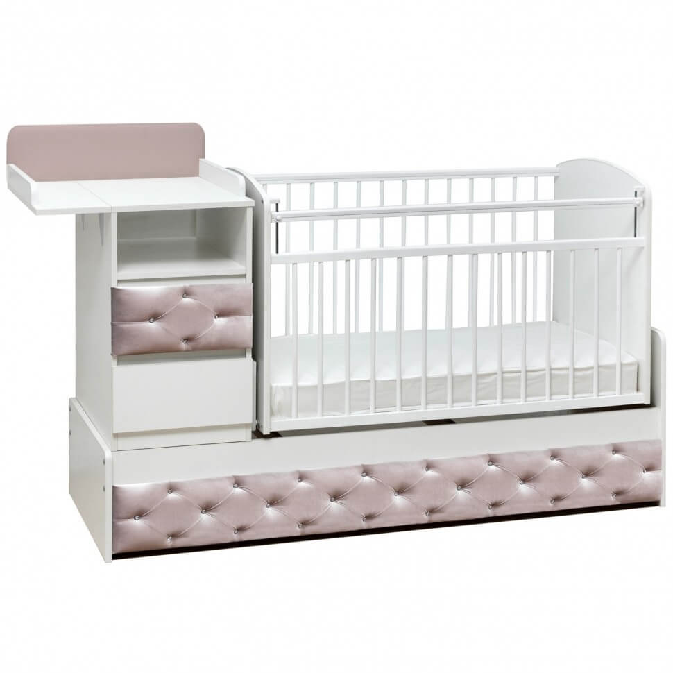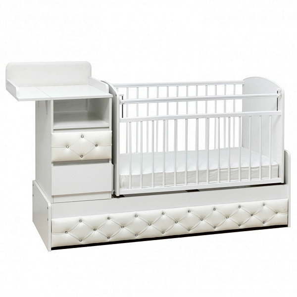 Для новорожденных в конструкции предусмотрена комфортная и безопасная кроватка с удобным столиком для пеленания. Столик съемный, удобный, оснащен мягким бортиком у изголовья. Также в комплектации есть комод.