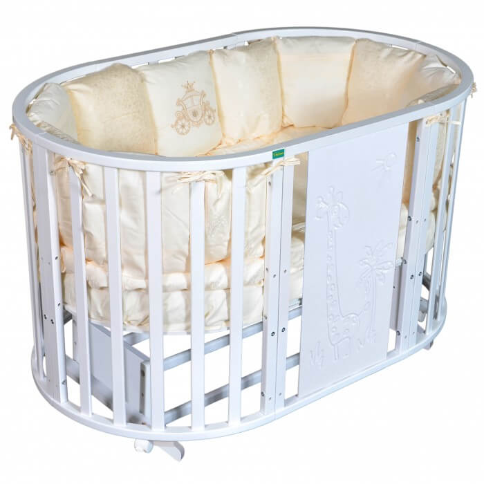 В овальной кроватке снимается передняя стенка. Ложе может двигаться и фиксироваться на трех уровнях по высоте. Сама спальная основа сплошная, с вентиляционными отверстиями. Постельные принадлежности и матрас в комплект не входят и приобретаются отдельно. Официальная гарантия на мебель от производителя — 18 месяцев.