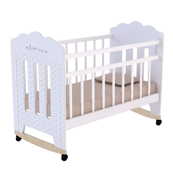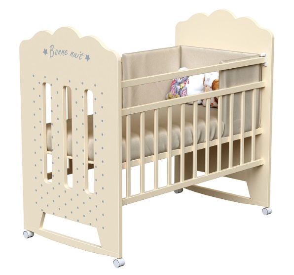 Функциональные плюсы — классическая качалка (полозья) и колеса. Полозья актуальны для маленький детей, на колесики кроватку можно поставить, когда ребенок подрастет. Ложе имеет два положения по высоте. Рейки сделаны из натуральной древесины, обладают ортопедическим эффектом и качественной вентиляцией. Стандартные размеры спального места (120x60 см) позволяют без труда подобрать матрас и постельные принадлежности.