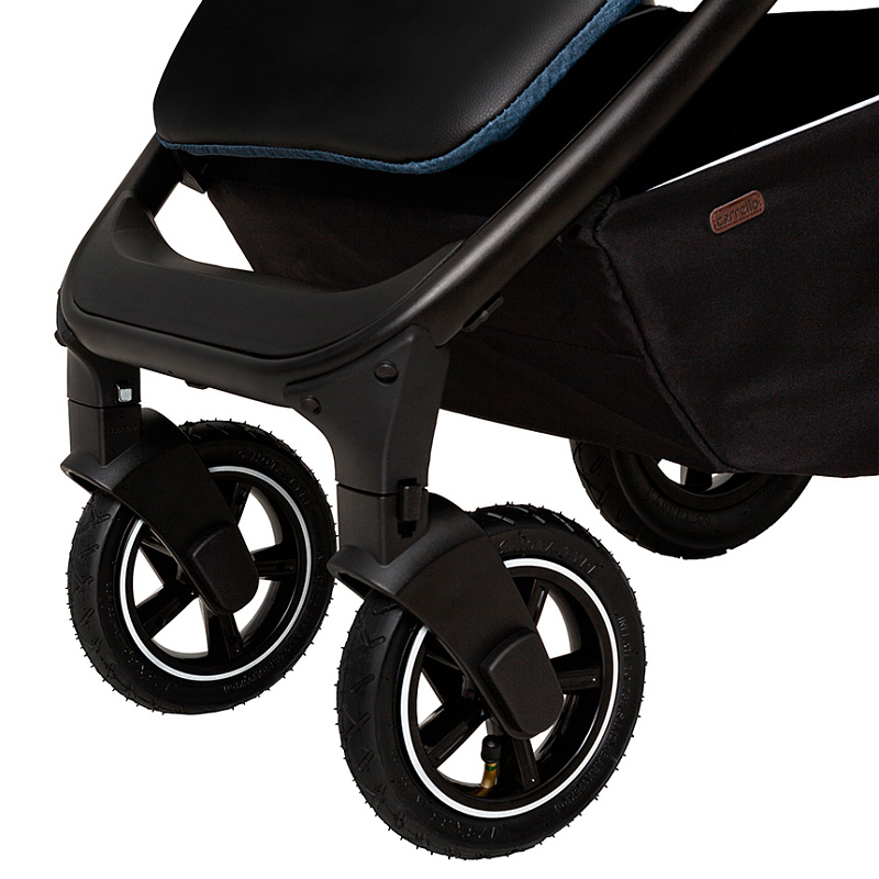 Высокая проходимость «прогулки» обеспечена крупными надувными колесами и дополнительным механизмом амортизации. Передние колеса, как водится, снабжены функцией свободного вращения с фиксатором для прямой езды. Встроенная амортизационная система позволяет с комфортом объезжать препятствия, а высокого качества покрышки обеспечивают высокую стойкость к износу в период эксплуатации. Все четыре колеса быстро снимаются. На задней оси расположен центральный тормоз. Надежность коляски — это не только колеса, но и прочная алюминиевая рама с повышенной грузоподъемностью.