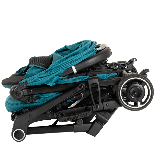 Рама алюминиевая, легкая. Коляска сама очень легкая. Колеса прочные, покрыты непрокалываемой вспененной резиной. Складывается рама одним нажатием на две кнопки на ручке. Защитный бампер съемный, откидной. Спинка откидывается в горизонтальное положение с помощью ремешка. Также в комплекте есть ремень для переноски.