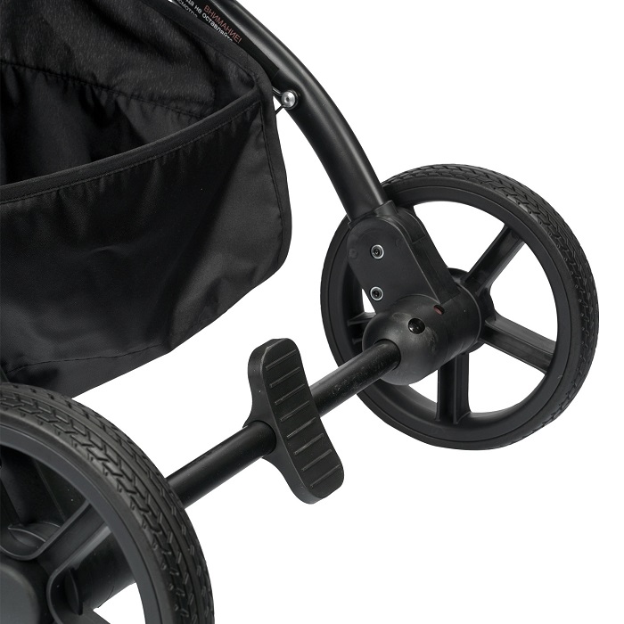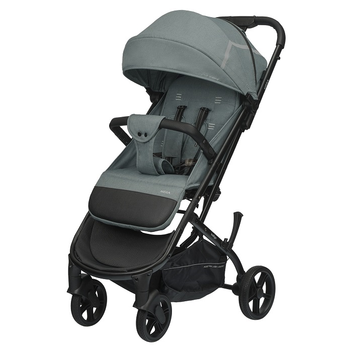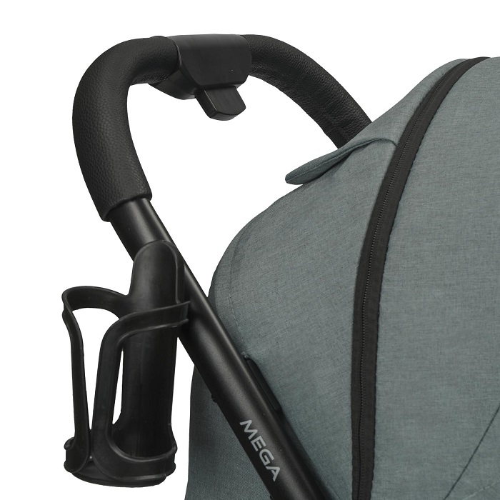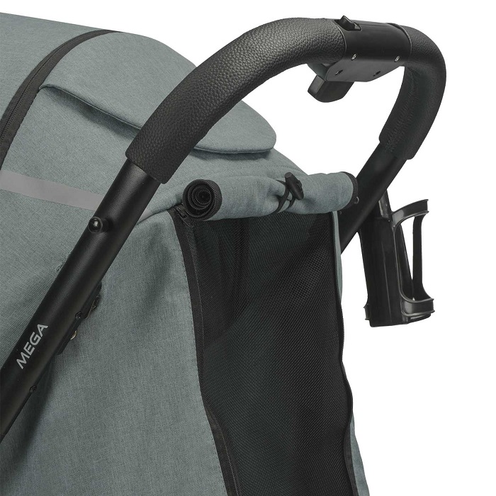 Для переноски коляски предусмотрена специальная ручка. На всех колесах установлена пружинные амортизаторы, обеспечивающие коляске плавный ход. Тормоз центральный, колеса сделаны из цельной вспененной резины. В комплект с коляской Мега входят москитная сетка, чехол, подстаканник.