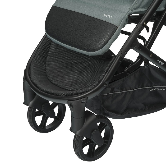 Модель Indigo Mega отличают легкий вес, компактное сложение и наличие чехла для перевозки. Это стильная прогулочная коляска, которая понравится любителям прогулок по городским паркам и торговым центрам. Вес этой оригинальной модели всего 7,6 кг, при этом у нее надежные резиновые колеса. Передняя пара поворотная, с возможностью фиксации, чтобы вы с одинаковым комфортом и эффективностью могли пользоваться коляской и на идеально ровном полу в торговом центре, и на городской плитке или тротуаре.
