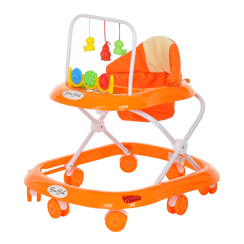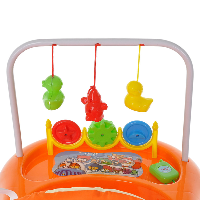 В ходунках широкое основание и 8 пластиковых поворотных колес. Есть тормозная система, позволяющая родителям стопорить устройство, если надо, чтобы ребенок поиграл в одном месте под присмотром. Игровая панель увлекает малыша, яркие погремушки не дают скучать.