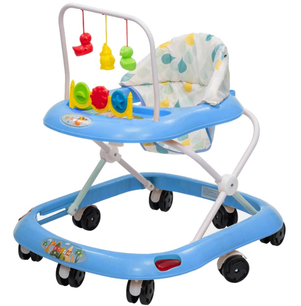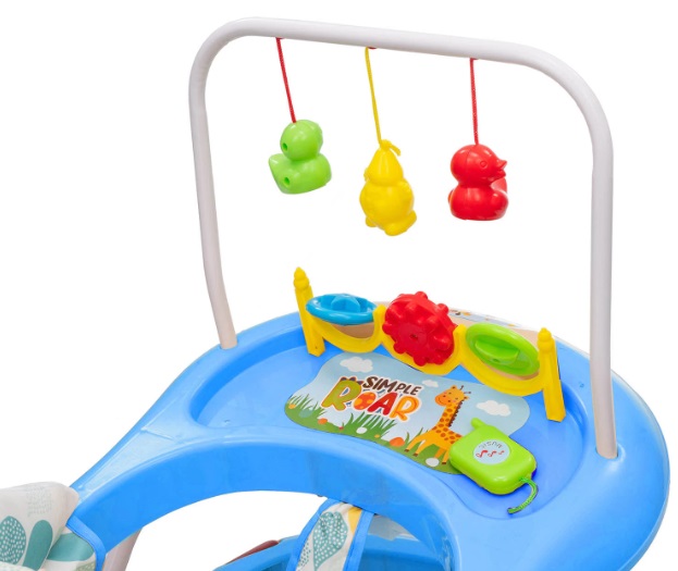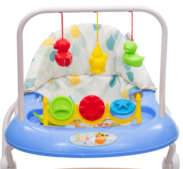 Ходунки оснащены прочным основанием и восемью подвижными колесиками из пластика, благодаря чему они легко двигаются и при этом сохраняют максимальную устойчивость. Игровая панель с красочными игрушками и музыкальным блоком (мелодия продолжительностью 22 секунды) увлечет ребенка на долгое время, а родителям подарит возможность посвятить время домашним делам. Панель работает от батарейки, которая входит в комплект.