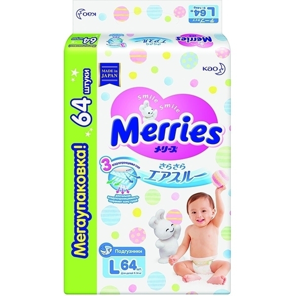 Детские подгузники Merries L, 9-14 кг, 64 штуки