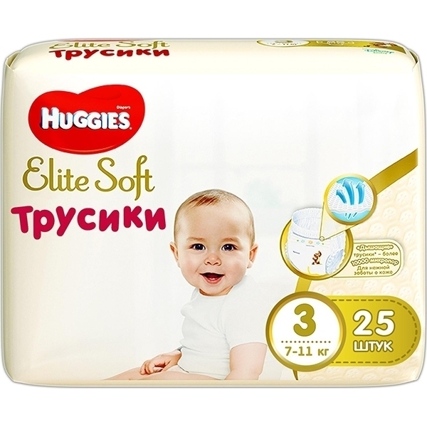 Дышащие детские трусики-подгузники Huggies Elite Soft просты в использовании, не натирают кожу, не вызывают раздражения. Они очень тонкие и приятные на ощупь, на теле ощущаются, как обычное хлопковое белье. Впитывающий слой моментально поглощает влагу, и равномерно распределяет ее по поверхности — это предотвращает провисание и сминание трусиков между ног. Эластичный поясок пропускает воздух, адаптируется под меняющийся размер животика малютки и не оставляет на коже следов.
