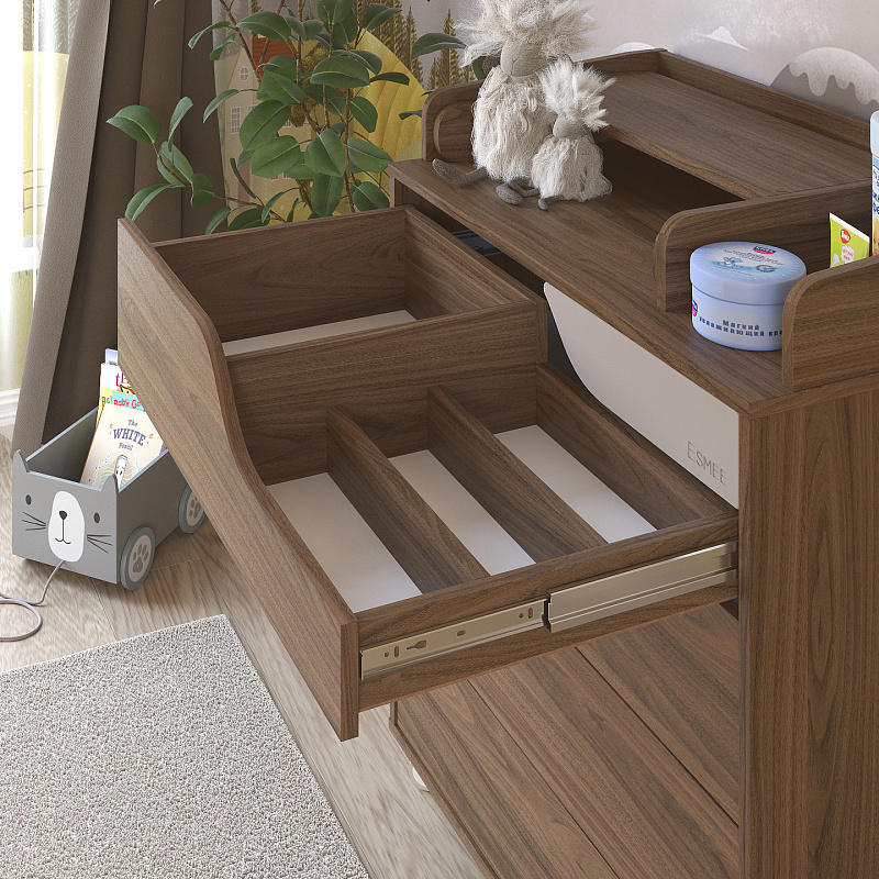 Предусмотрено много комбинаций и расцветок, благодаря чему комод Esmee легко подобрать под конкретный дизайн детской комнаты, от нейтральных спокойных оттенков до более выразительных решений. За счет сочетания пеленальной зоны, органайзера и пяти вместительных ящиков модель выступает как многофункциональный элемент мебели, объединяющий хранение и уход в одном компактном корпусе.