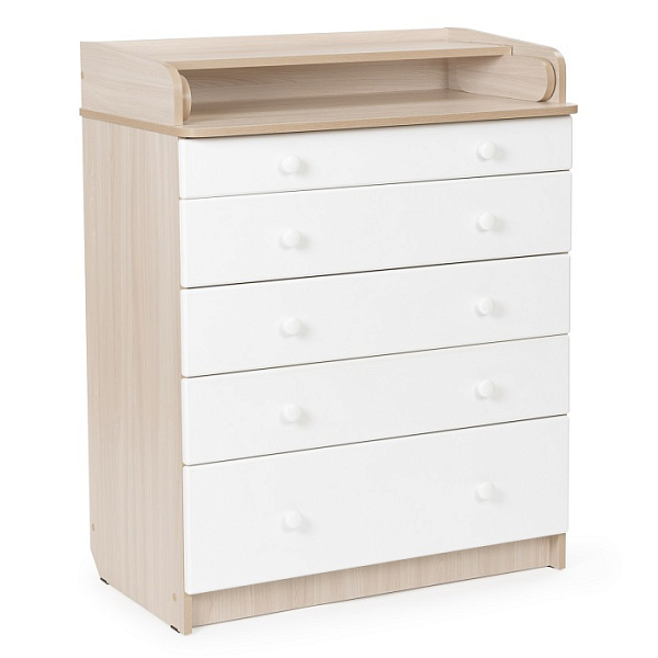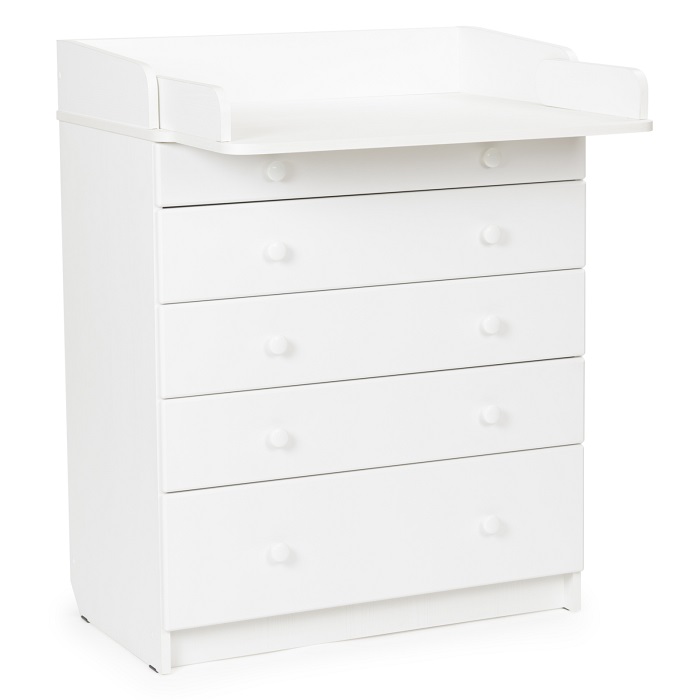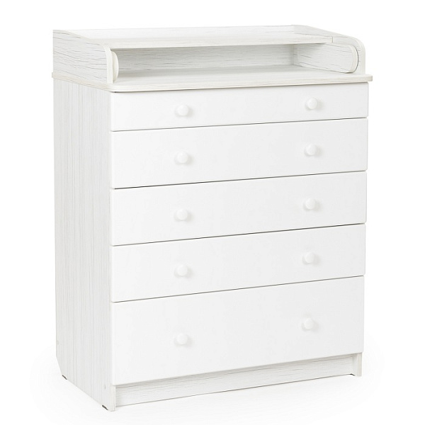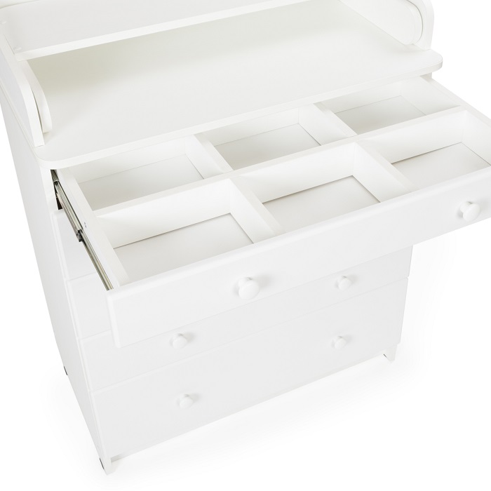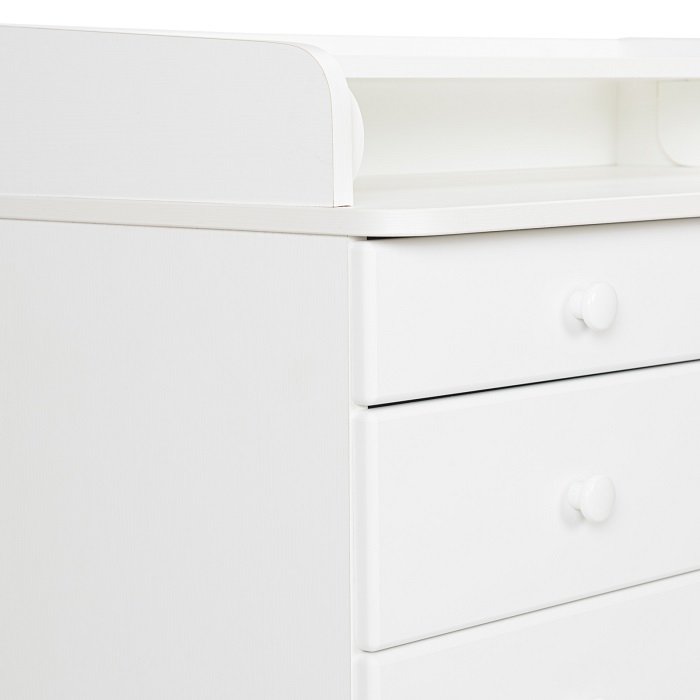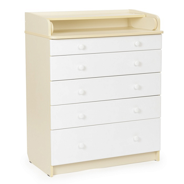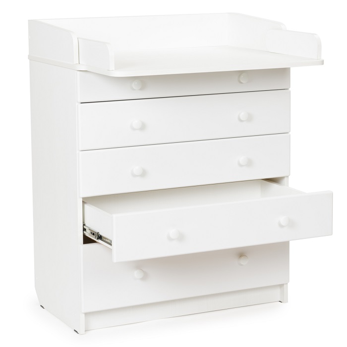 На комоде оборудован складной столик для пеленания. С его помощью можно переодевать ребенка и проводить любые гигиенические процедуры. Когда столик становится ненужным, его можно компактно сложить и использовать в качестве дополнительной полочки. По бокам есть бортики-ограничители с защитой от падения.