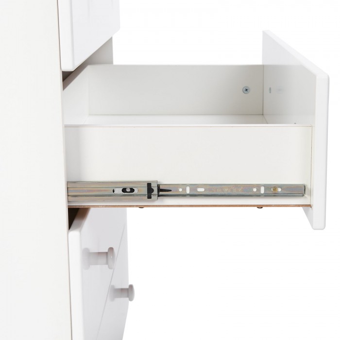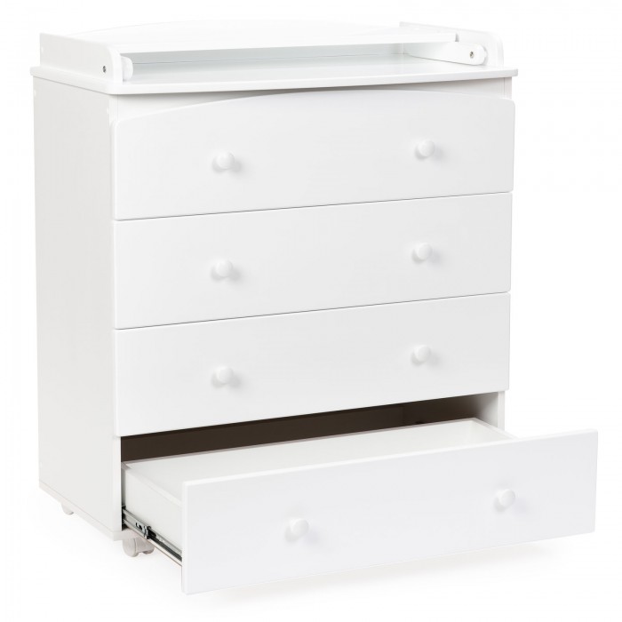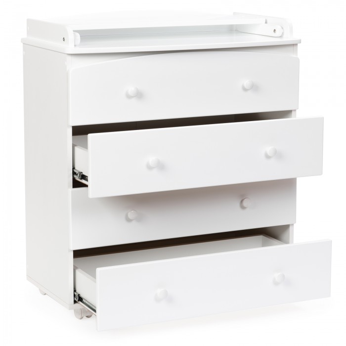 Четыре больших ящика на шариковых направляющих ходят тихо, не разбудят малыша. В них можно поместить всю одежду ребенка, предметы гигиены, другие вещи. Пеленальный столик удобный, быстро и просто раскладывается. Когда ребенок подрастет, его можно сложить и использовать как дополнительное место для вещей.