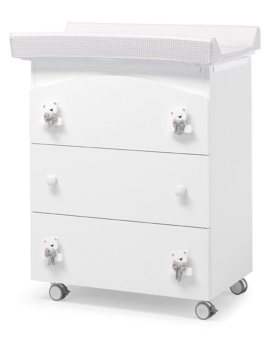 Этот пеленальный комод итальянской марки Erbesi выполнен из натурального бука. Покрыт панелями ПВХ с нулевым уровнем формальдегидов. Оснащен четырьмя поворотными колесами с резиновым покрытием. Два колесика имеют фиксаторы.