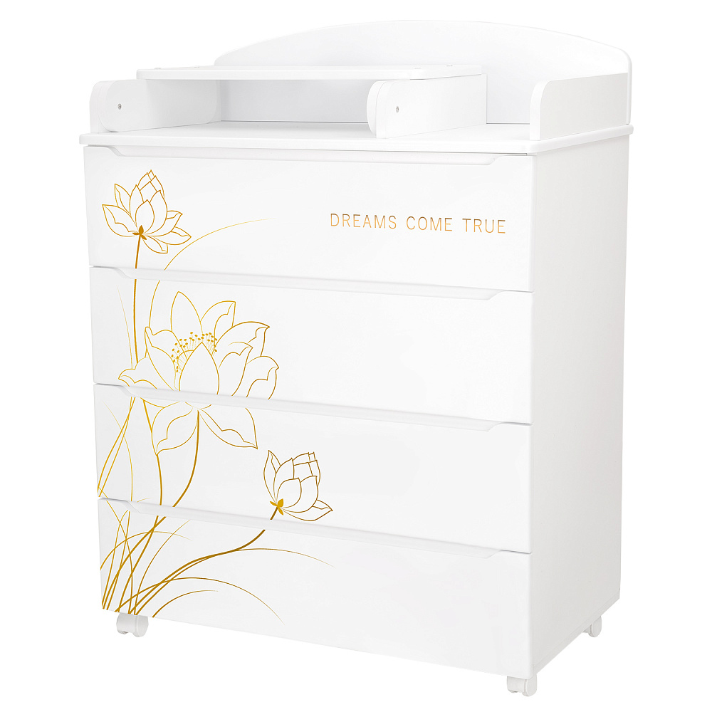 Само изделие выполнено из экологически чистого МДФ. Пеленальный столик при необходимости легко сложить. Модель дополнена современными интегрированными ручками. В комплект входят удобным колеса, на двух из них установлены стопоры для фиксации в нужном месте.