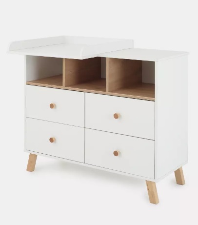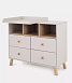 Вместительный пеленальный комод изготовлен в скандинавском стиле и имеет четыре выдвижных ящика. Элегантная модель дополнена усиленными телескопическими направляющими, а также необычными скошенными ножками, съемной накладкой для пеленания с возможностью установки в двух положениях..