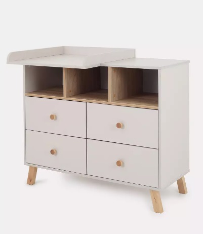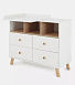 Благодаря комфортной ширине комода в 100 см вы можете легко переодевать ребенка и хранить прямо под рукой предметы гигиены. В устройстве предмета мебели предусмотрены три открытые полки для быстрого доступа к подгузникам и другим нужным вещам. .