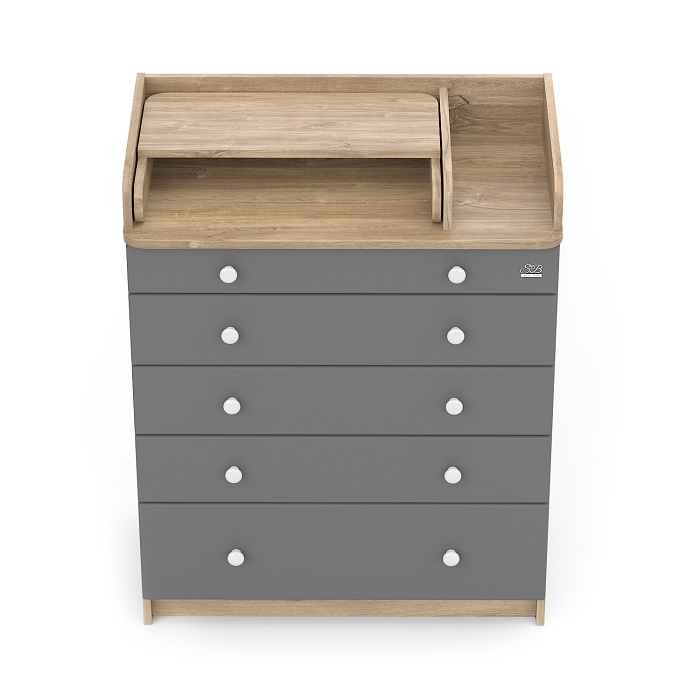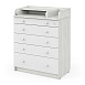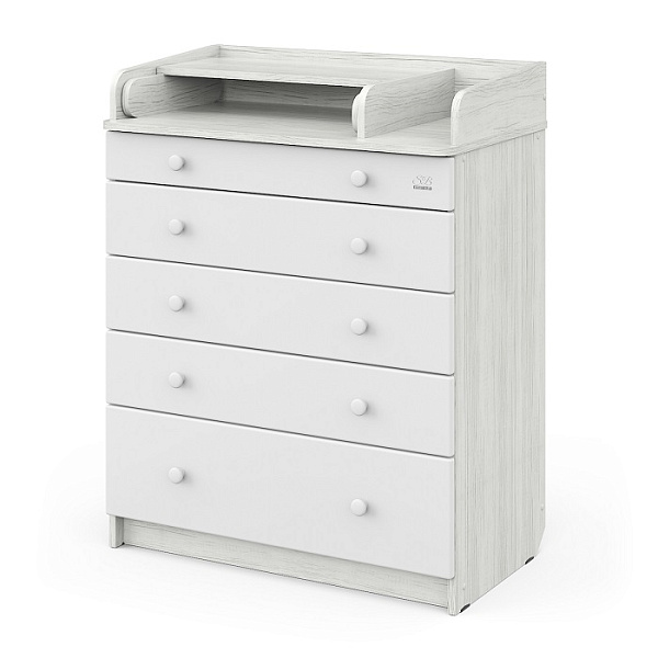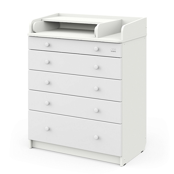 С комодом идет складной пеленальный столик, на котором можно пеленать и переодевать ребенка, проводить гигиенические процедуры. Если пеленальная поверхность не нужна, ее можно компактно сложить и использовать в качестве дополнительной полки.
