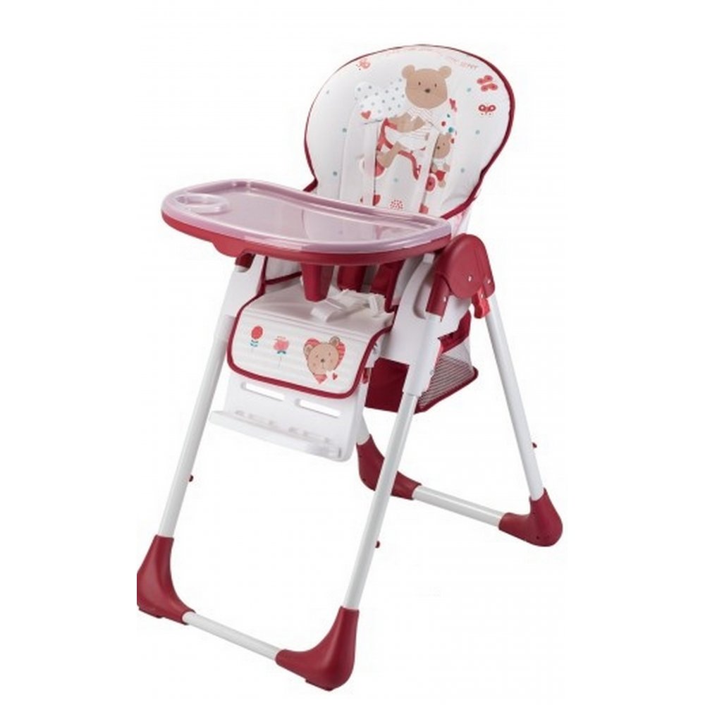 Для безопасности ребенка предусмотрены 5-точечные ремни безопасности и съемная перемычка между ножками, которая препятствует соскальзыванию ребенка с сиденья. Чехол также легко снимается для чистки. Под сиденьем оборудована корзина для игрушек и предметов гигиены. Стульчик произведен из пластика.