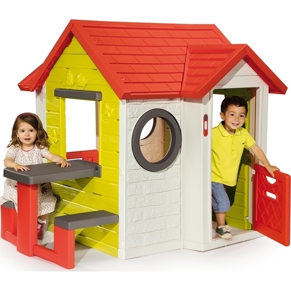 Игровой детский домик со столом Smoby оснащен задней дверцей, позволяющей выйти в сад. Входная дверь запирается ключом.