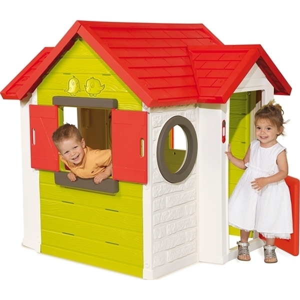 Красивый коттедж создан французскими дизайнерами из упрочненного пластика, устойчивого к деформациям на солнце и морозе. Входная дверь запирается ключом. В ней предусмотрено отверстие для писем и настоящий звонок для гостей. Окошки оснащены подвижными ставнями. Их легко открыть, когда жарко, и закрыть по окончанию игры. Дополнительно домик оборудован двумя иллюминаторами, обеспечивающими свободное поступление света внутрь помещения.