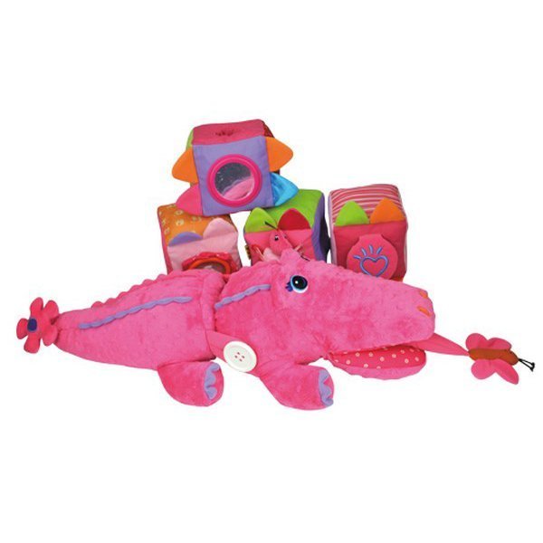 • Розовый крокодильчик состоит из 6 блоков, из которых 4 кубика вмещают в себе разноплановые и интересные развивающие элементы.