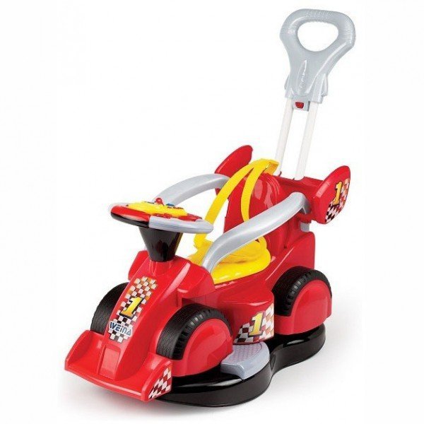 Симпатичная каталка, выполненная в стиле боллидов Формулы-1, подарит Вашему ребенку массу позитивных впечатлений. Каталка может использоваться как ходунки за счет удобной спинки. ВЫ также можете взять машинку-каталку с собой на прогулку вместо коляски за счет удобной выдвижной родительской ручки. Благодаря передним поворотным колесам машинка очень маневренная, ею легко управлять. Под сидением располагается небольшой багажник, в который можно положить необходимые на прогулке игрушки. Игровая панель на руле оснащена различными кнопочками, при нажатии на которые играет веселая музыка. Панель съемная, с ней можно играть дома на полу. Каталку можно трансформировать еще и в качалку, что делает ее незаменимой игрушкой. Но это игрушка не только доставляет радость крохе. Она еще и помогает ему развивать очень важные навыки – координацию движений, чувство равновесия, сильные ножки, а игровая панель способствует развитию мелкой моторики.